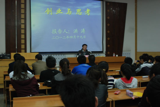 洪涛董事长结合自己的创业历程,讲述了创业目的、创业思维、创业方法、创业的基本操作、创办企业的思想准备等内容,并和在场的师生们分享了创业心得。他提出,要多和成功人士交往,要多留心周围的点滴小事并研究商业模式,要养成良好的理财习惯和风险意识,要善于把大目标分解成为小目标,把问题分开解析,同时要善于把不相干的东西联系起来,找到结合点,寻找创业契机。随后,洪涛董事长对师生们关心的问题进行了解答。