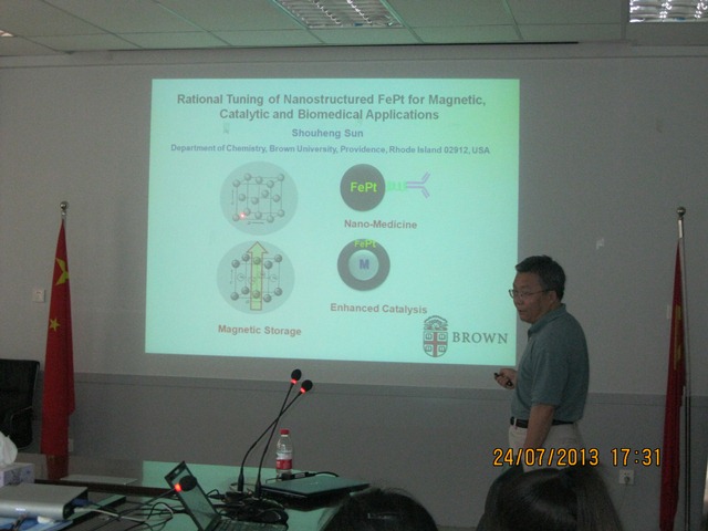 724日下午500甘肃省生物电化学与环境分析重点实验室、化学化工学院、生态环境高分子材料教育部重点实验室、甘肃省高分子材料重点实验室及科技处的邀请,美国布朗大学教授、布朗大学分子与纳米前沿研究所副所长孙守恒教授莅临365上市公司官网进行学术交流,并在9号楼1609多媒体教室做了题为《Rational Tuning of Nanostructured FePt for Magnetic, Catalytic and BiomedicalApplications》的精彩学术报告,365上市公司官网教师、研究生60余人聆听了本次报告会。