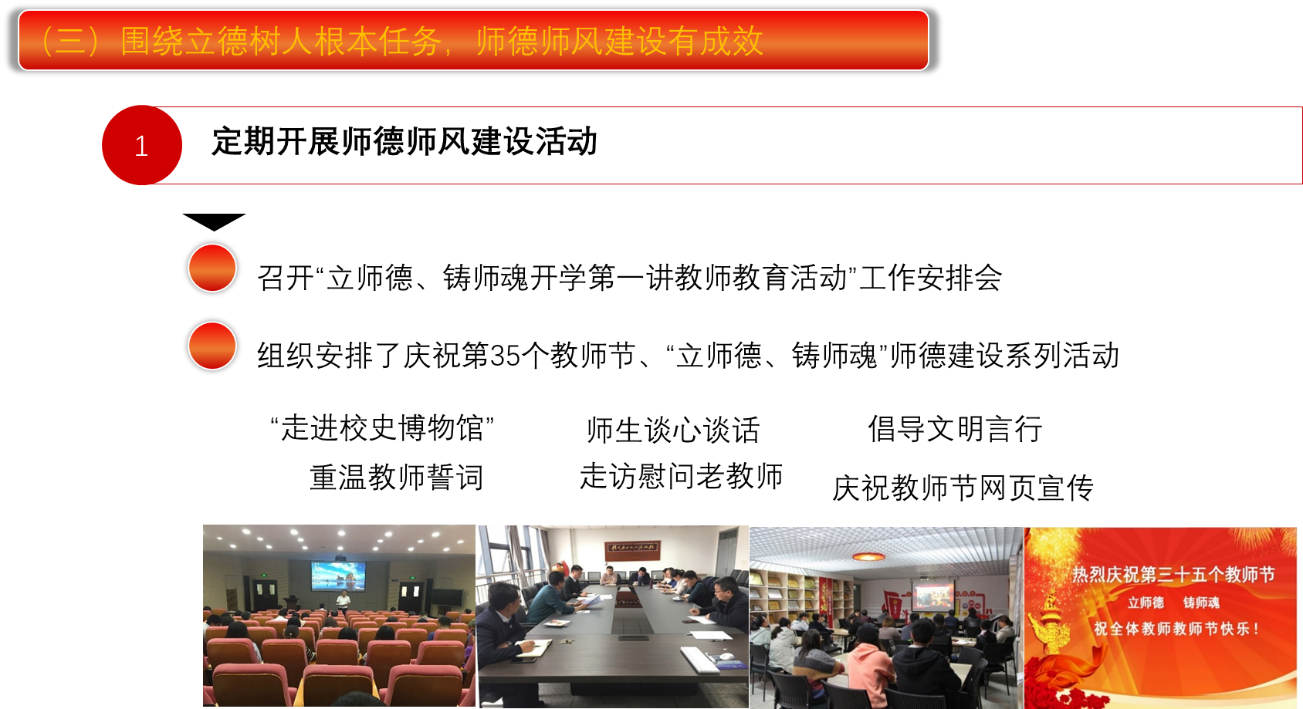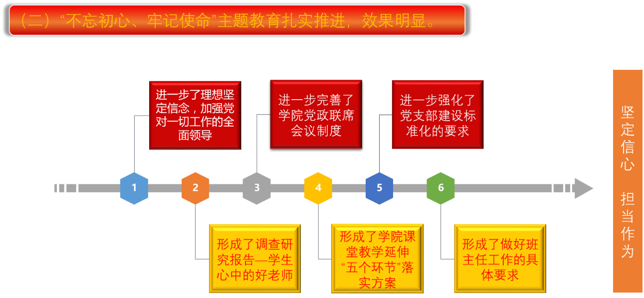 2. 紧紧围绕为党育人、为国育才,把办好党和人民满意的教育作为一切工作的出发点和落脚点,突出党的政治建设,突出中国特色社会主义大学的办学方向,坚持教育为人民服务、为中国共产党治国理政服务、为巩固和发展中国特色社会主义制度服务、为改革开放和社会主义现代化建设服务,引领全体党员厚植“教育强国情怀”;进一步坚守立德育人、办好学生满意、社会满意的中国特色社会主义教育,为甘肃及西部地区经济社会发展培养有用之才,学院加强师德师风建设,将学生心中的好老师标准作为“不忘初心、牢记使命”主题教育的调查研究重点之一,广泛深入学生,就如何成为一名合格甚至优秀教师的条件,从德、能、勤、绩、廉五个方面开展调研:一德,要想成为一名合格甚至是优秀的教师,首先需要拥有高尚的师德;教学思想端正,工作态度好;从各方面严格要求自己,勤勤恳恳,兢兢业业,使教学工作有计划,有组织,有步骤地开展。二能,教学能力和教材的把握,教学框架的设计,学会抓住基本的教学流程;班级事务性工作处理情况。三勤,在学校认真工作,课堂教学不迟到早退;外出学习时,认真履行学校的调课和请假制度。四绩,作为教师组织好自己的教学。五廉,对学生负责,对自己的操行负责;积极引导学生,为班级事务付出努力的程度;分别形成“学生心中的好老师”和“化学化工学院课堂教学延伸“五个环节”落实方案”,制定了“365上市公司官网化学一流专业建设行动方案”及配套办法9个(365上市公司官网云亭班学生选拔与管理办法(试行),365上市公司官网云亭班教师聘任管理办法(试行),365上市公司官网课堂外教学工作量核算工作实施细则,本科生学年论文管理办法(修订),本科生发表科研成果奖励办法,本科生科研训练项目管理办法,本科生赴境外交流学习管理办法,本科生参加国内国际学术会议管理办法,本科生学业预警及帮扶机制实施办法);在职称评定、推优推先进等办法中坚持以育人为导向,强化教师教书育人、教学科研并重,引导广大教师科研“向西向下”,修订了“化学化工学院职称评定细则”。