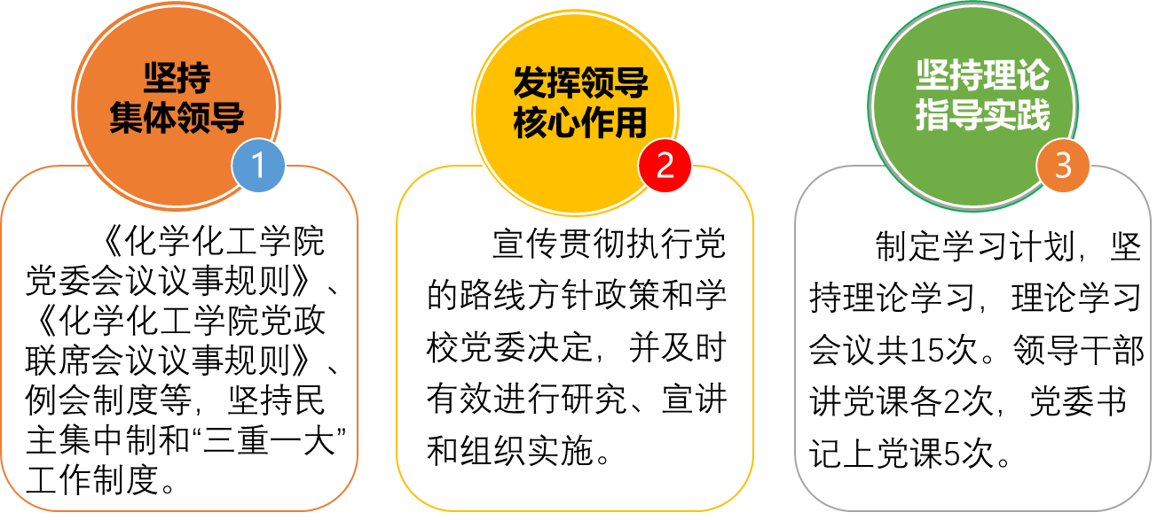 化学化工学院领导班子坚持用习近平新时代中国特色社会主义思想武装头脑,坚守为党育人的初心、为国育才的立场,紧紧围绕立德树人这一根本任务,着力构建德智体美劳“五育”并举的人才培养体系和全员全过程全方位育人的体制机制;把教师队伍作为办好教育的第一资源,贯彻新时代高校教师职业行为准则,加强拔尖人才、领军人才引进培养;不断深化教育教学改革,加快协同育人领域改革,扭转不科学的教育评价导向;切实发挥把方向、作决策、带队伍、保落实的作用。