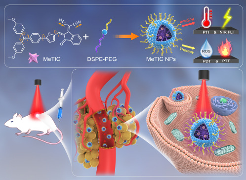 在前期工作的基础上马恒昌课题组通过精准的分子设计开发了基于AIE的新型的多模态诊疗一体化的有机小分子光诊疗剂,首次通过官能团工程将多种功能官能团巧妙的引入到单个小分子中,实现了激发态激子辐射与非辐射跃迁、非辐射跃迁中系间窜越与热效应的调控。该光疗剂(MeTIC)展现出了优异的光物理、光动力和光热性质,具有高的摩尔吸光系数、明亮的延伸至近红外区二区的荧光发射、优于孟加拉玫瑰红(RB)的高效活性氧生成效率、高的光热转换效率。通过DSPE-PEG2000包覆制备的MeTIC NPs不仅很好的保留了小分子优异的性能而且显示出优异的稳定性和生物相容性,能够被细胞很好的摄取且在EPR效应下在肿瘤组织富集明显。体内外实验均表明MeTIC NPs在660 nm光照下具有良好的抑瘤能力,有效的弥补了单一光动力治疗或光热治疗存在的缺陷。这项研究不仅开发出新型基于AIE有机小分子的光诊疗剂而且对精准分子设计这一策略进行了概念验证。相关成果发表在美国化学学会顶级期刊ACS Nano (2021, 15, 7328-7339, IF = 15.88)。