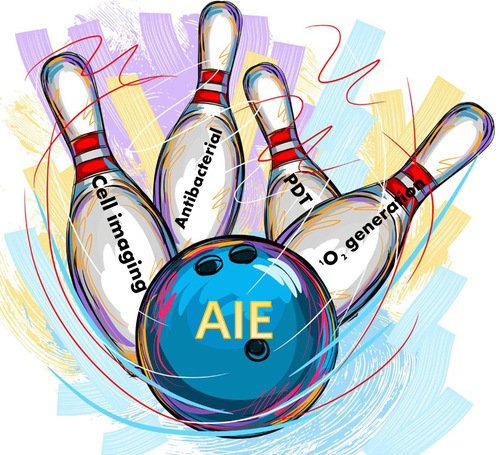 马恒昌课题组长期致力于新型光学诊疗材料的开发及体内外治疗的研究,取得了一系列重要的进展。传统光学诊疗材料受限于聚集荧光猝灭(ACQ)、光稳定性差、吸收/发射波长短、摩尔吸光系数低等缺点严重限制了其实际应用。为了解决这一系列问题,马恒昌课题组基于聚集诱导发光现象开发出一系列用于诊疗的新型光学诊疗材料,在体内外均表现出优异的抑瘤能力。首先基于三苯胺的富电子结构实现更高效率和更强光稳定性光敏剂的开发。D-A结构的分子以及重原子的引入能够对HOMO-LUMO能级调整减小ΔEST。通过对分子的给-受体结构以及重原子对光动力治疗(PDT)的影响进行了系统的研究,成功将其应用于癌细胞光动力治疗、革兰氏阴性菌和革兰氏阳性菌的光动力抗菌和斑马鱼活体成像。相关成功发表在美国化学学会期刊ACS Appl. Bio Mater. (2020, 3, 1187−1196).