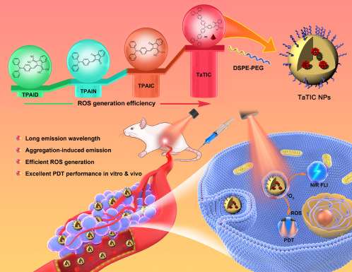 在上述工作的基础上马恒昌教授团队于2021年报道了一种提高光敏剂性能的新方法,通过整合并调控ΔEST和SOC促进的基团,发展了一类具有AIE效应的高效光敏剂,成功用于成像指导的癌症光动力治疗。将提高SOC的羰基和强缺电子氰基以茚满为骨架巧妙地引入到具有强给电子能力的三苯胺(TPA)衍生物中,通过精确调节分子中氰基和羰基的比例以及TPA部分的给电子效应,调控ΔEST和SOC常数的大小,进而调控并促进AIE光敏剂的ROS产生效率。结果表明AIE光敏剂TaTIC同时具有高的SOC常数和低的ΔEST值,实现了两者的平衡和最佳化,展现了最优的光敏性能,其ROS产生效率远优于商品化的RB。此外,得益于典型的AIE特性、强D-A作用和无重原子效应,通过两亲性基质包裹制备的TaTIC纳米粒拥有长的吸收波长、明亮的近红外区荧光发射和较好的生物相容性,在近红外激光照射下实现了对荷瘤小鼠彻底治愈的结果。该工作为高效光敏剂的开发提供了成功范例和新的设计理念。相关成果发表在wiley数据库生物材料类顶级期刊Biomaterials (2021, 275, 120934, IF = 12.48)。