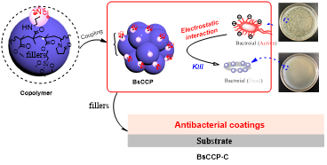 首先,开展了特殊形貌阳离子聚合物Janus微球的合成及其在高效抗菌涂料的应用。以常见的丙烯酸酯类单体、苯乙烯单体及阳离子单体,水为溶剂,采用一锅无皂乳液聚合法,精确控制合成工艺与条件(表面活性剂、引发剂、温度、单体比例等因素),成功合成了具有广谱抗菌活性的黑莓形阳离子共聚物颗粒(BsCCP),并将BsCCP乳液加入到内墙涂层中,得到了BsCCP基涂料(BsCCP-C)(Scheme 1)。评价了其对大肠杆菌和金黄色葡萄球菌的抗菌活性,讨论了其抗菌机制。发现BsCCP具有高效的抗菌活性,有望成为一种能够快速有效抵抗细菌繁殖的抗菌涂层材料。该成果以论文“Preparation of blackberry-shape cationic copolymer particles for highly effective antibacterial coatings发表在Colloids and Surfaces A: Physicochemical and Engineering Aspects, 2021, 614, 126202.(化学2区,IF4.53);另一篇论文“Synthesis of cationic acrylate copolyvidone-iodine nanoparticles with double active centers and their antibacterial application发表在Nanoscale, 2020, 12, 21940-21950(工程I区,IF7.79)。第一作者为李雪梅(硕士研究生)。