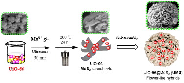 首先,充分利用MOFs材料中UiO-66具有高比表面积、大孔隙率、高热稳定性、化学稳定性、优异的水中结构稳定性和显着的强酸性、中等碱度的耐受性等特点,通过简单的水热反应构筑了一种高光催化活性的花状杂合体异质结材料,为医疗废水的光催化处理提供了一种新思路。通过将UiO-66分散到MoS2的前驱体溶液中,在水热反应过程中经过静电诱导自组装构建花状杂合体材料(Scheme 3)。之后,将其应用于医疗废水抗生素的降解,同时通过ICP-MS对杂合体光催化剂中金属离子的溶出进行了检测,并结合自由基捕获实验探讨了花状UiO-66@MoS2杂合体的光降解机理。发现所制备的光催化材料不但具有高的催化活性,而且可循环使用。