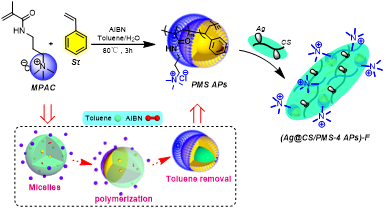 其次,进行了蠕虫状共聚物Janus微球的合成及高效抗菌活性复合材料的制备。采用悬浮聚合和界面聚合相结合的方式,亲水性的阳离子型丙烯酸酯(MaC)和疏水性的苯乙烯(St)为聚合单体,甲苯为合成Janus微球的软模板剂,成功合成了具有高效抗菌活性的蠕虫状共聚物Janus微球(PMS-WJMs)。然后将PMS-WJMs与银负载壳聚糖(Ag@CS)结合,制备了无机纳米微粒负载天然高分子/合成高分子(Ag@CS /PMS-WJMs)复合材料(Scheme 2),目的是作为一种新型的双活性抗菌材料,用于抑制细菌的感染和繁殖。考察了合成材料的抗菌活性,发现合成的PMS-WJMsAg@CS/PMS-WJMs对典型的大肠杆菌和金黄色葡萄球菌显示出良好的抗菌活性。制备的PMS-WJMsAg@CS/PMS-WJMs能被用作抑制细菌感染和繁殖的新型抗菌材料,抗菌蠕虫状聚合物颗粒在新型界面材料的制中具有重要的意义。该成果以论文“Synthesis of Ag@chitosan/copolymer with dual-active centers for high antibacterial activity发表在International Journal of Biological Macromolecules, 2021, 174: 198-206(高分子科学1区,IF6.95),第一作者为王斌(博士研究生)。另一篇论文“Antimicrobial Cationic Acrylate-based Hybrid Coatings against Microorganism Contamination发表在Progress in Organic Coatings, 2020, 142: 105576(材料科学I区,IF5.16)。王发伟(硕士研究生)和王斌(博士研究生)为共同第一作者。