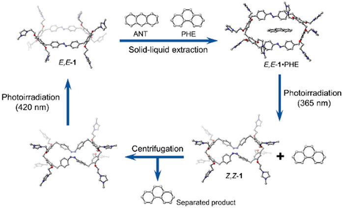 基于大环主体的主客体识别一直以来都是超分子化学研究的核心内容,冠醚、环糊精、杯芳烃、葫芦脲和柱芳烃被称为是超分子化学发展史上最重要的五代大环主体分子,每一代大环主体分子的出现都极大地推动了超分子化学的发展。考虑到设计合成新的大环主体化合物及其主客体分子识别以满足主客体化学研究和发展的需求、进一步丰富超分子化学的研究领域,一直以来都是超分子化学家们所努力的一个方向。365上市公司官网青年教师史兵兵与浙江大学黄飞鹤教授合作,构筑了一系列具有光响应性的偶氮苯大环芳烃分子,实现了光控主客体络合与解络合,并成功地将该主客体分子识别应用于芳香类化合物同分异构体的光控吸附分离。相关研究成果发表在综合类国际顶级期刊J. Am. Chem. Soc. 2021, 143, 3081−3085;Angew. Chem. Int. Ed. 2021, 60, 5766−5770。