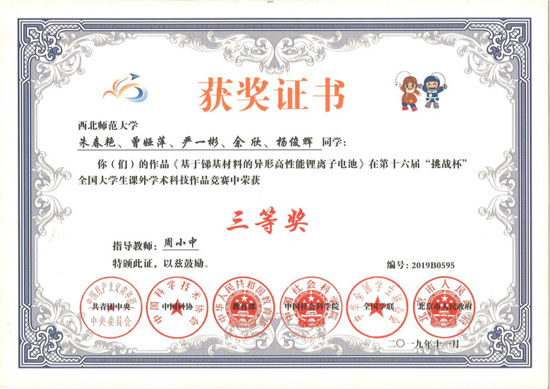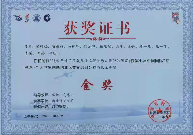 材料科学与工程专业同学获第十六届“挑战杯”全国大学生课外学术科技作品竞赛三等奖和第七届中国国际“互联网+”大学生创新创业大赛甘肃省分赛高教主赛道金奖证书