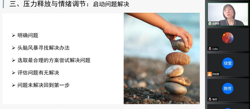 讲座伊始,朱雅雯副教授以认识自我为切入点,通过讲解弗洛伊德的人格结构,将本我、自我、超我与同学们当下的状态紧密结合,并强调了学生当下的社会身份与角色扮演,以更好的确立个人未来的发展目标。随后,从应激、应激反应和应激源的角度来指导大家识别和评估当下面临的压力,使大家认识到在应激源的影响下,每一位同学的认知、情绪、行为和生理等方面都会存在不同的情绪反应。最后,朱雅雯副教授从练习正念冥想、捕捉生活中的美好、启动问题解决、提升人际技能、提升专业能力、情绪管理五常法等方面指导大家去释放学习生活中的压力,尤其是在疫情的影响下,同学们更应该少点负面情绪,多做一些有意义的事,以更好的状态去面对新的挑战。