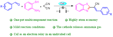 2-取代苯并噻唑是一种重要的氮杂环化合物,具有广泛的生物活性,普遍存在于天然产物和药物分子中,由于其特殊的双环体系而受到了广泛的关注。我们利用电化学反应的优点和多组分反应的高效性,用易得原料芳香醛类化合物、丙二睛、2-氨基苯硫酚在电反应条件下高效合成2-取代苯并噻唑,使用电子作为无质量试剂,完全避免了传统化学试剂外部氧化剂的使用,从而消除废物的产生(图1)。
