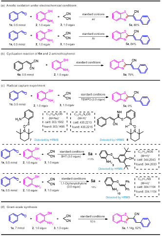 通过优化反应条件,我们共合成了18个目标产物,收率最高91%。为了阐明可能的反应机理,我们设计了一系列的控制实验(图2)和循环伏安实验。首先,标准反应条件下,该反应在空气和氩气气氛中都能顺利进行,以高产率得到目标化合物5a。证明了该反应中涉及电化学阳极氧化,而不是空气中氧气的氧化(图2a)。为了探究反应过程中可能存在的中间体,我们用化合物6a与2-氨基苯硫酚在最优条件下进行反应,分离出79%的目标产物5a。说明该反应过程中涉及苯甲醛与丙二睛发生Knoevenagel缩合反应生成缩合产物1,2-二氰基苯乙烯(图2b)。接着我们进行了自由基捕获实验,利用自由基捕获试剂包括TEMPO、BHT和1,1-二苯乙烯对该反应进行自由基抑制实验,发现该反应被完全抑制,从而表明该反应转化中涉及自由基。通过HRMS检测到了自由基捕获化合物8, 9, 10,表明了反应过程中自由基B与D的存在(图2c)。随后,我们对该反应的实用性进行了研究。首先在标准条件下将底物1a, 2, 3的反应体系进行了克级规模的放大实验,结果以62%的产率得到了1.14 g的克级产物(图2d)。