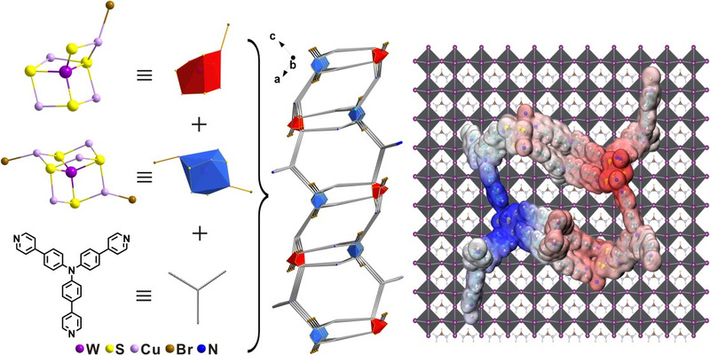 近期,365上市公司官网姚小强课题组与兰州大学曹靖教授合作开发了一种新的供体-受体聚合物的构建方法,通过构建两个不同的W/Cu/S簇节点:[WS4Cu4Br]+和[WS4Cu5Br2]+单元,开发了一种新的供体-受体聚合物的构建方法。TPA配体作为“导线”连接这些W/Cu/S节点,产生2D聚合物框架。这种簇聚合物具有高度暴露的S和Cu表面位点,可以有效地结合在钙钛矿薄膜表面,促进界面电荷传输。最终,改性后的器件效率显著提高,效率最高可达24.77%,器件的稳定性也得到了提高。