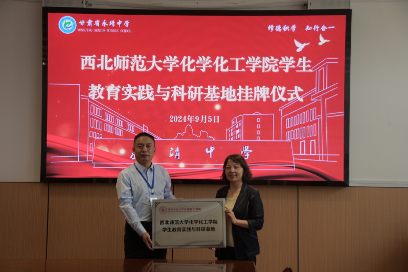 2024年9月5日上午,化学化工学院党委书记王秀珍、院长宋鹏飞、副院长郭昊及科普研究院常务副院长莫尊理赴甘肃省永靖中学开展访企拓岗活动,举行“学生教育实践与科研基地”挂牌仪式。永靖县教育局教研室主任马明仲,永靖中学校长郭福祥,副校长王国泰、窦先东、姬军义、赵军及相关负责人参加了此次活动。