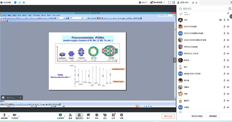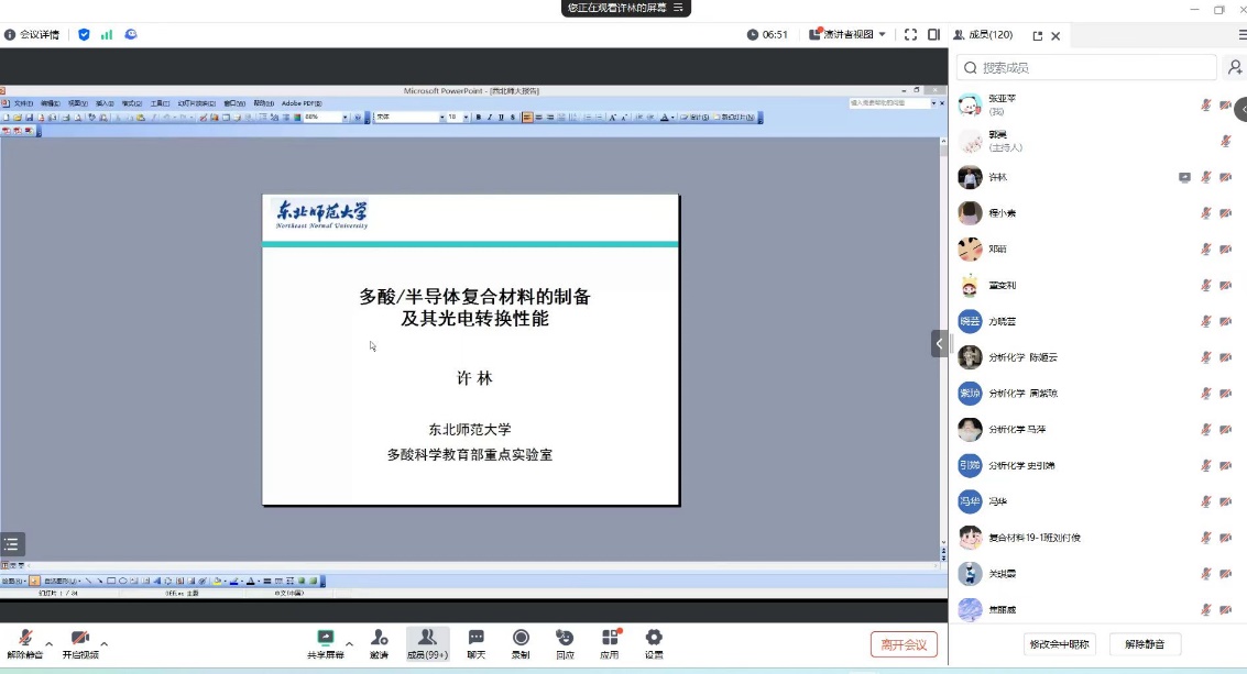 2024125日,受365上市公司官网邀请,东北师范大学化学学院许林教授在线上为365上市公司官网师生作了题为“多酸/半导体复合材料的制备及其光电转换性能”的学术报告,学院师生180余人参加了报告会。