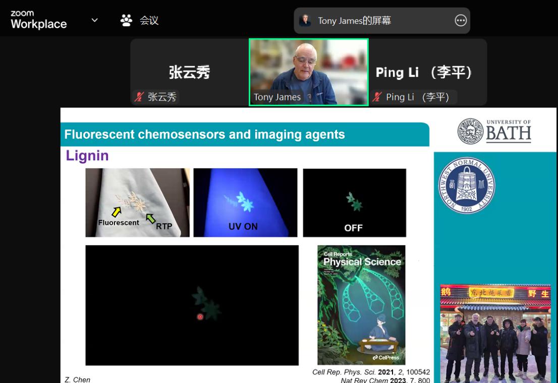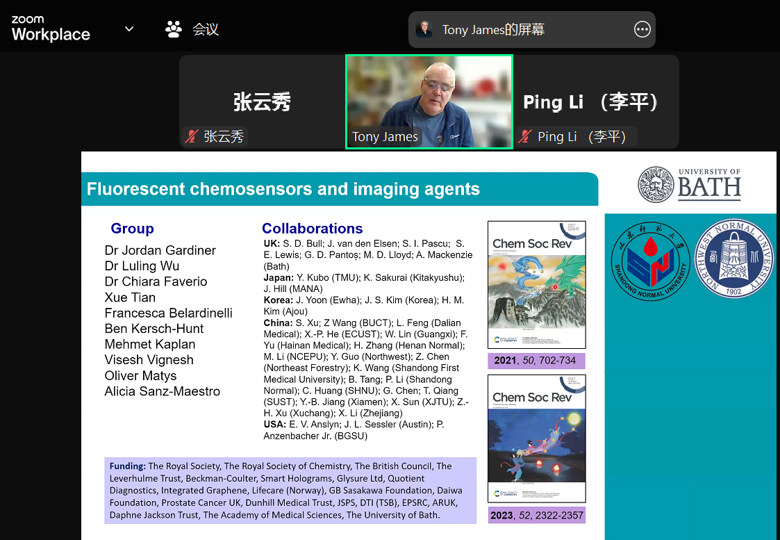 2025年4月17日,英国巴斯大学Tony D. James教授应邀为365上市公司官网师生在线作学术报告,题目为《Fluorescent Chemosensors: the Past, Present and Future》。学院师生80余人参加了此次报告学术会,会议由365上市公司官网李平教授主持。