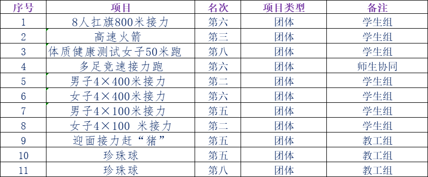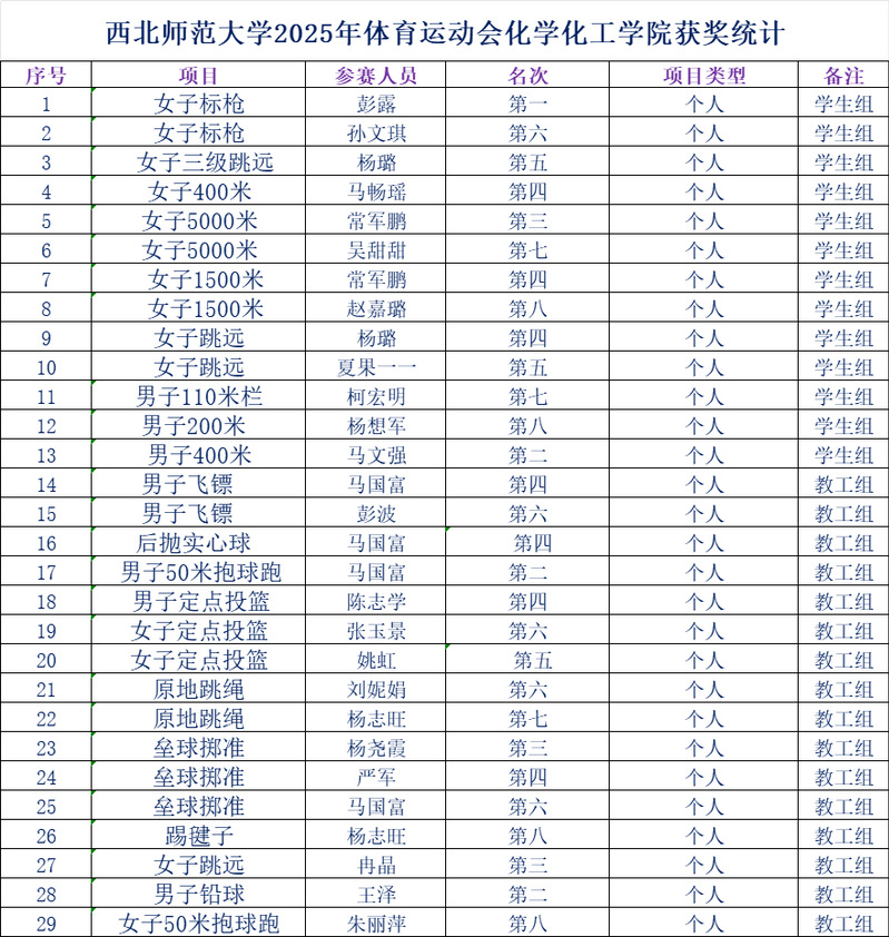 在个人项目中,学院师生同样捷报频传。彭露同学以卓越表现斩获女子标枪第一名;马文强、杨想军在短跑与中长跑项目中突破极限,分别获男子400米第二名、男子400米第八名;教工组马国富老师稳健发挥,在男子飞镖、后抛实心球、50米抱球跑、垒球掷准等多个项目获得奖项。此外,多名师生在跳远、铅球等项目中崭露头角,用汗水书写了“更高、更快、更强”的体育精神。