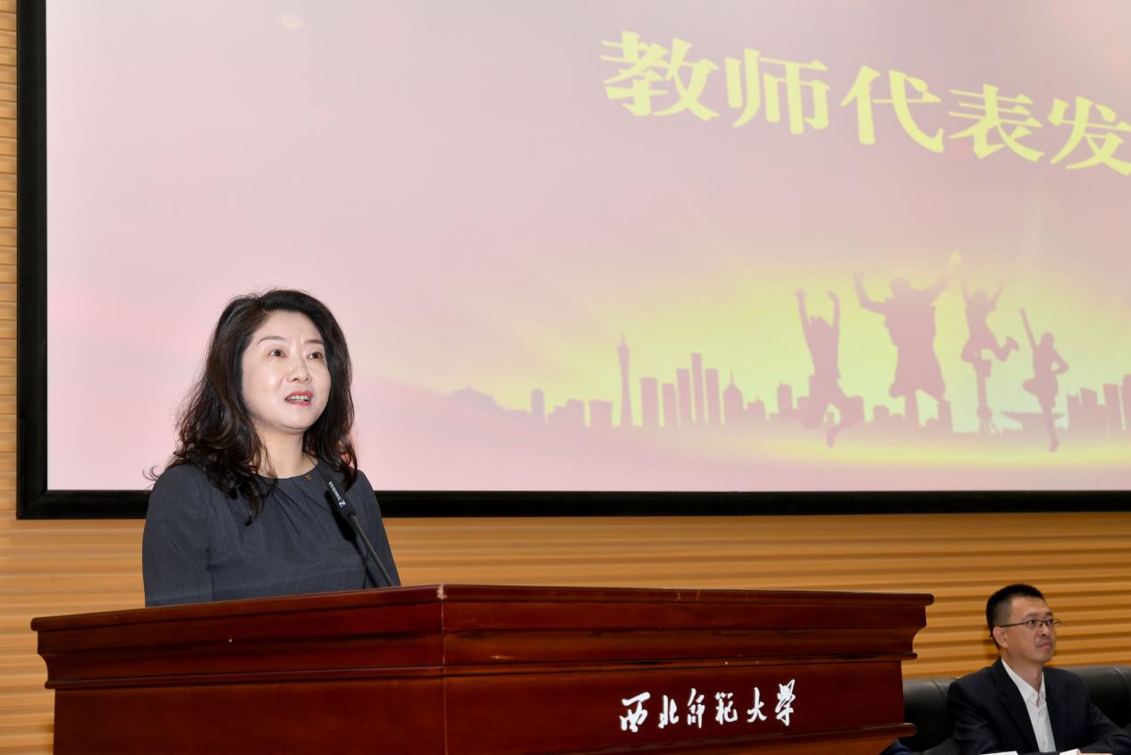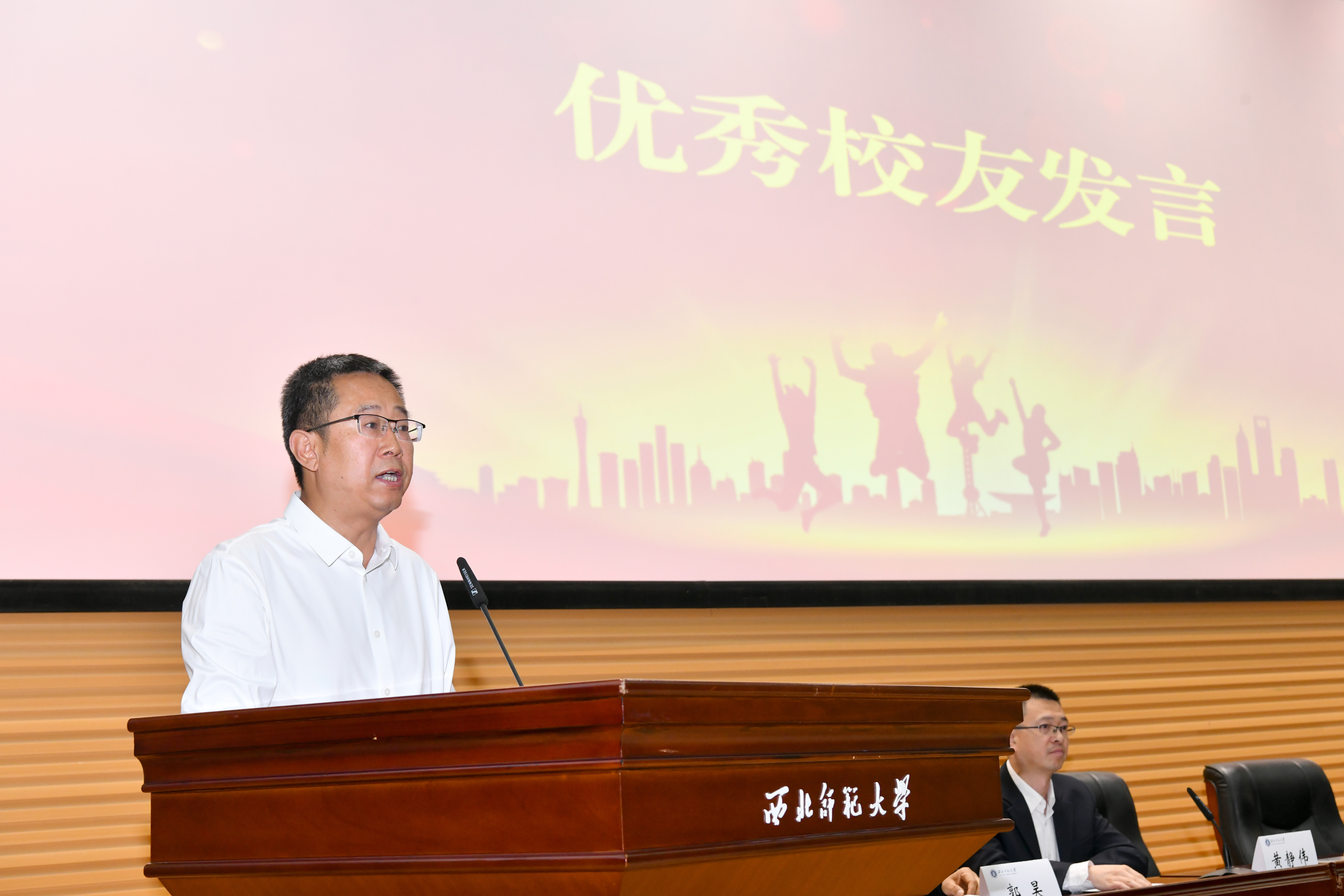 在温馨感人的氛围中,毕业生代表向教师代表敬献鲜花,以表达对老师们辛勤培育的感恩。一束束鲜花传递着毕业生对老师们的深深敬意与不舍。随后,教师代表王雪梅寄语毕业生:“你们即将离开校园,踏上新的人生征程。希望大家继续保持对化学的热爱与敬畏,保持对知识的渴望与追求。校友代表杨涵雄以“带着爱一路成长,始终追寻真善美的光”为题分享了自己的人生感悟。杨涵雄叮嘱毕业生:“毕业不仅是一种仪式,更是一份承诺,希望学弟学妹们以独立的人格拥抱世界,以创造的姿态书写未来”。