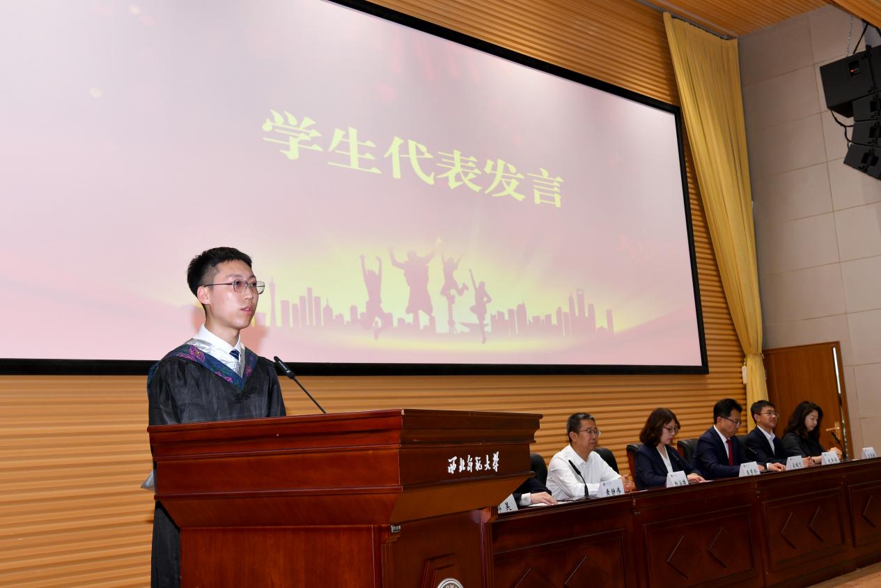 毕业生代表屠颢潆同学在发言中深情回顾了在校期间的点点滴滴,代表全体毕业生表达了对学校学院精心培养的感激之情,希望全体毕业生保持“行胜于言”的作风,用双手绘制理想的蓝图。通过持续不断努力,在各自岗位上继续发光发热,为国家、社会的发展贡献自己的力量。