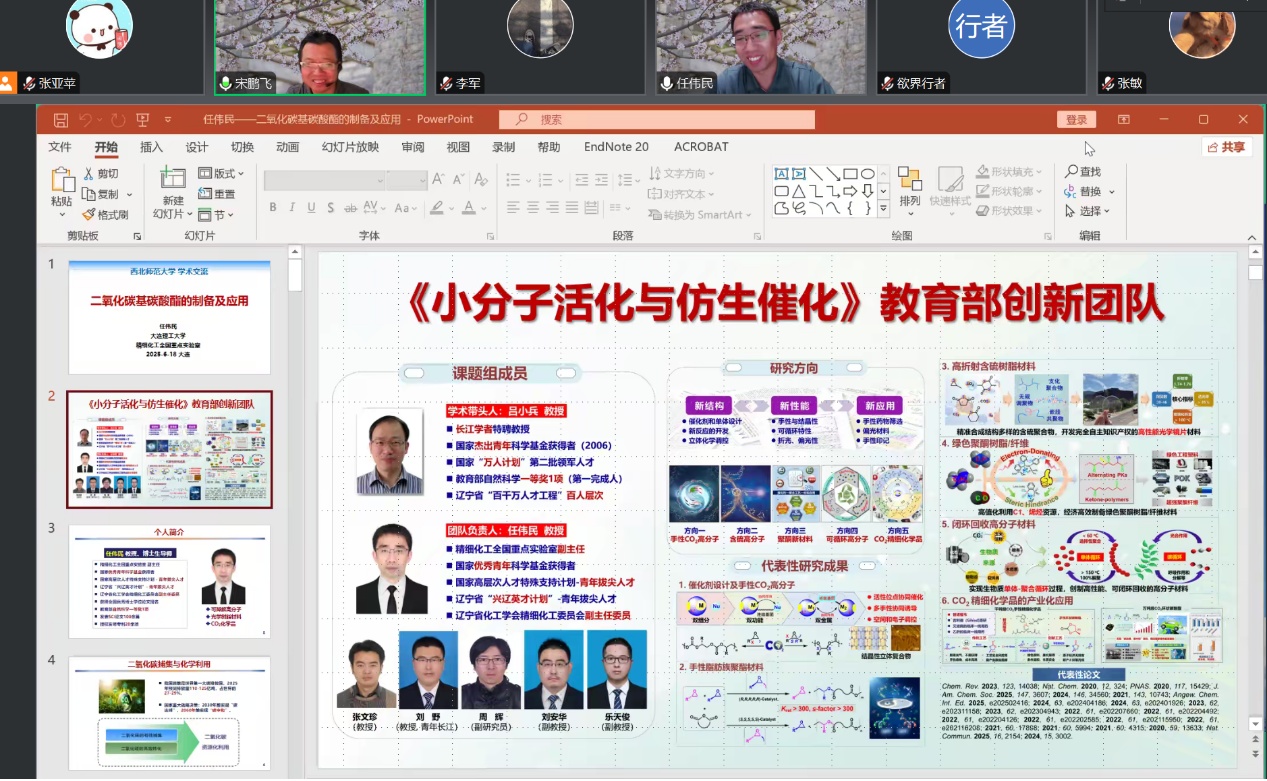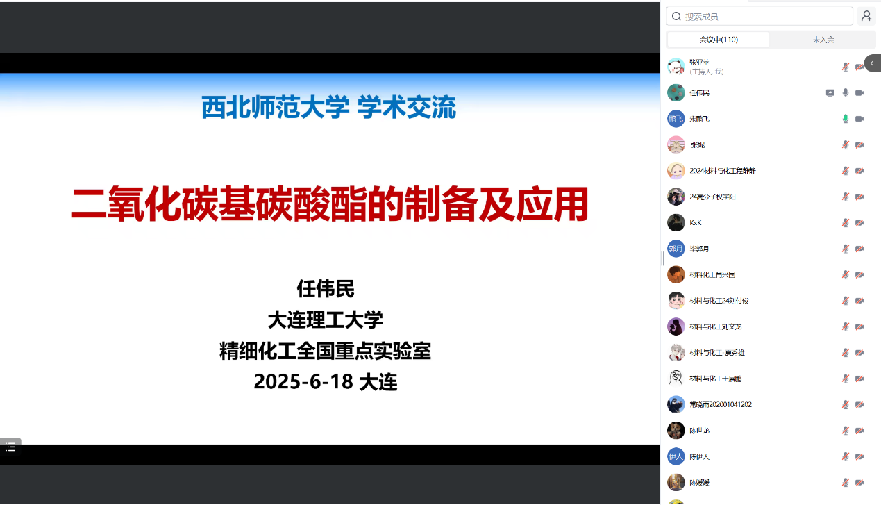 2025年6月18日,受365上市公司官网化学工学院邀请,大连理工大学精细化工全国重点实验室副主任任伟民教授,通过线上为365上市公司官网师生作了题为“二氧化碳基碳酸酯的制备及应用”的学术报告,学院师生140余人参加了报告会。
